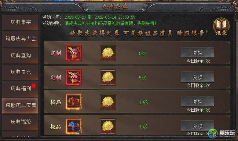 1、「庆典宝库」消耗庆典券,全服兑换指定道具,全服限量;