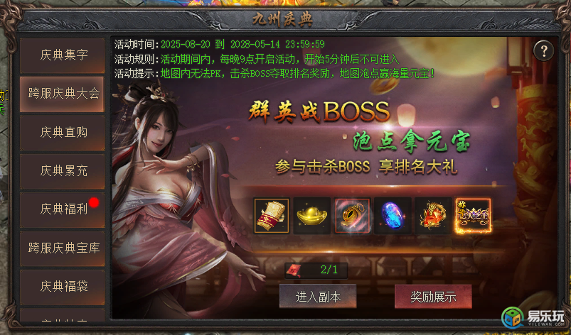 2、「庆典烟花大会」消耗门票,跨服世界BOSS,争夺庆福券;