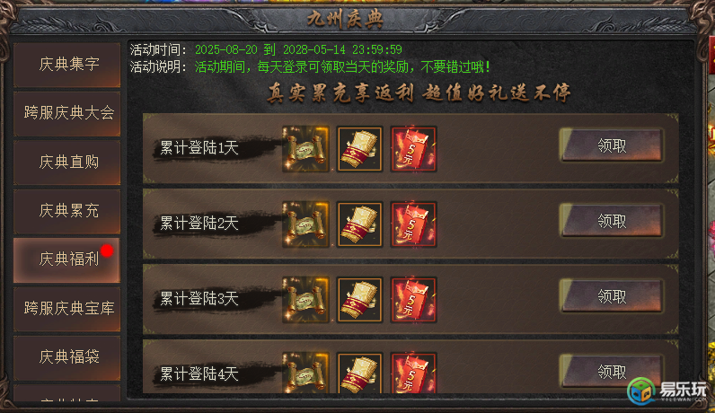 3、「庆典福利」登录送红包、养成材料、庆典券道具;